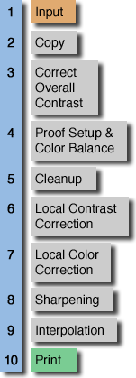 The order in which these six "instruments" of Sharpness, Brightness, Contrast, Color, Cropping, and Defects are handled when diagnosing and printing is not important. What usually happens is that the worst offender is often recognized first, as it tends to be the most glaring of the group. In a normal photograph, however, in which all the instruments are relatively equal, there is a consistent way to deal with them all. It's called a workflow.